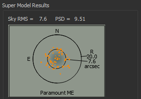 Super Model Super Model?  Not a Tyson Beckford, Ashley Graham, or Cindy Crawford. A mathematical model of all of the ways error can creep in to impact the pointing accuracy of the telescope.  In our case, we took an initial star position, measured it to be out of alignment, made a correction, and then took 60 additional points around the sky.  Using the TSX TPoint Super Model capabilities, it calculates the amount of correction needed for each direction that the Paramount ME will point.