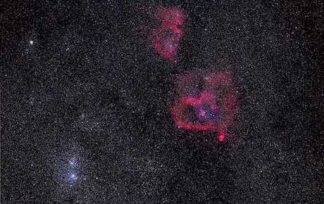 From the Canon 6D + 200mm f/2.8 lens, we are testing the correct settings as we trial some data. Here is the region around the Double Cluster in Perseus, along with the IC1805 and IC1848 otherwise known as the Heart and Soul Nebulae.