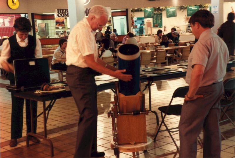 Astronomy Day 1984 (May 5) in Kingston, Ontario. Hein van Asperen with his home-made 10 Newtonian on Dobsonian mount. Leo Enright is on the right.