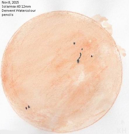 Kim Hay writes: This is a sketch of the Sun done on 2015 November 8 with a Coronado SolarMax 60. It is one of my first essays using Derwent Watercolour pencils.