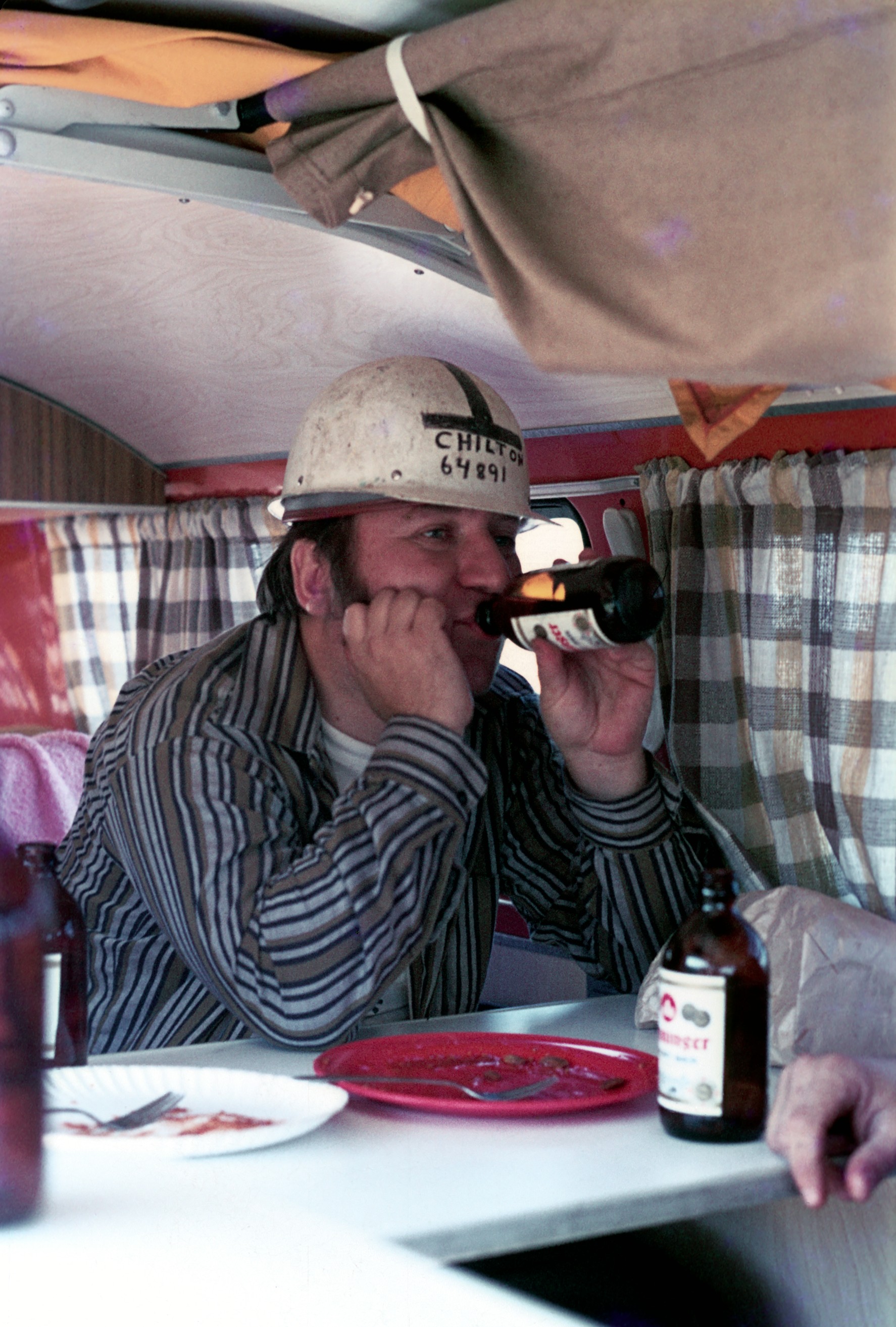 Ken Chilton enjoying a beverage with someone (Bob Speck) in the VW Camper.