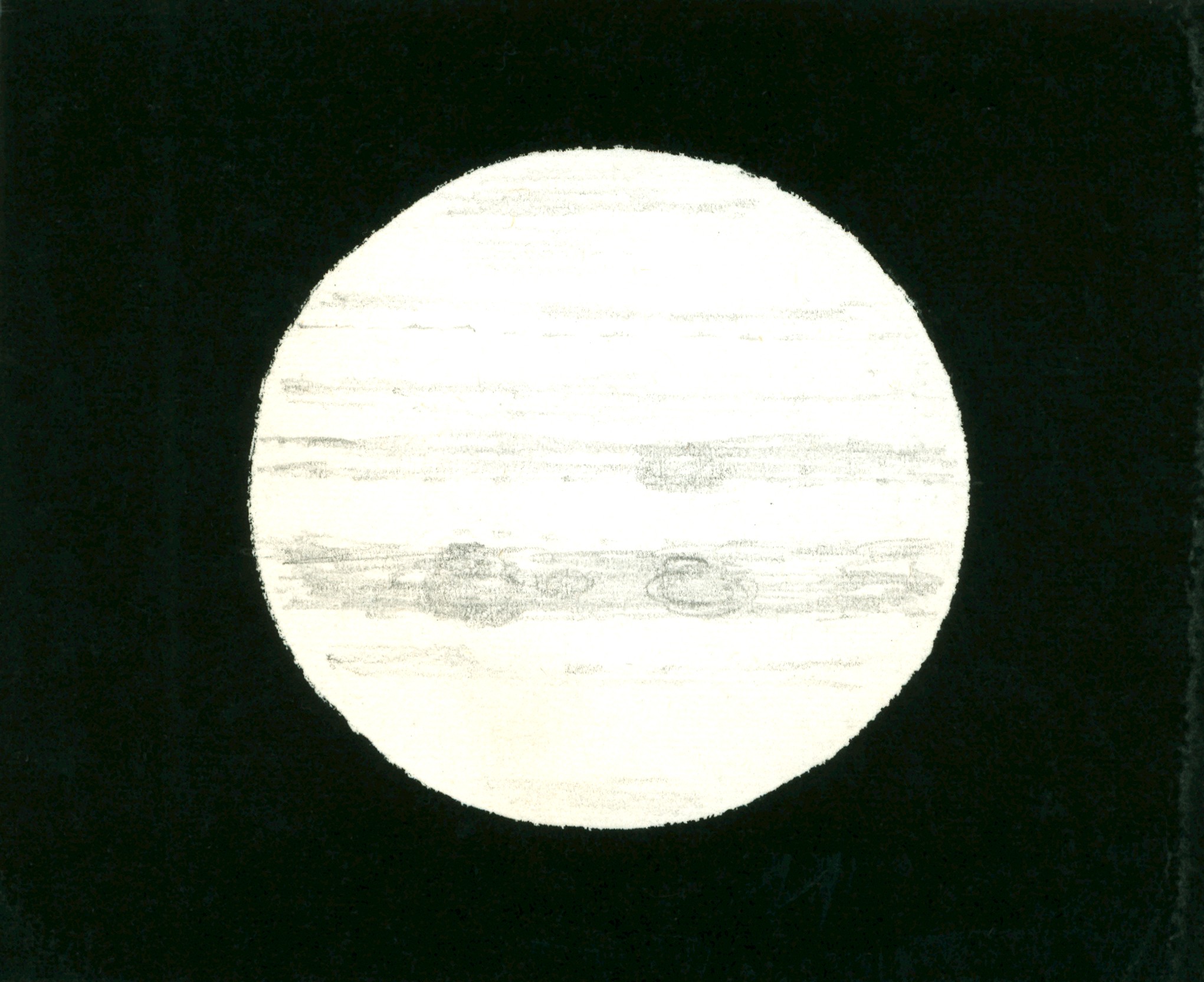 Jupiter on 1959 May 9/10 at 00:10 local time (05:10 UT) [possibly 04:10 UT –GG.] C.M.(1) 194º, C.M.(2) 48º. 6½" refractor at 222x. Seeing 6 (good). Transparency 3. North is down. Sketch by Klaus Brasch.