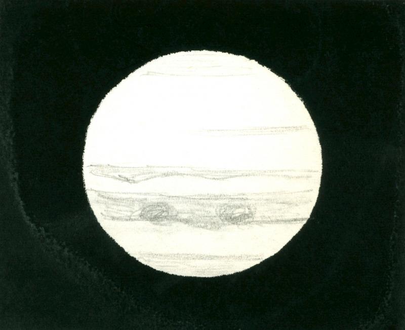 Jupiter on 1959 June 11/12 at 22:45 EDT (02:45 UT) as sketched by K.R. Brasch. C.M.(1) 317º, C.M.(2) 279º. 3" refractor at 100x. Seeing 4. Transparency 2. Sky somewhat milky. North is down.