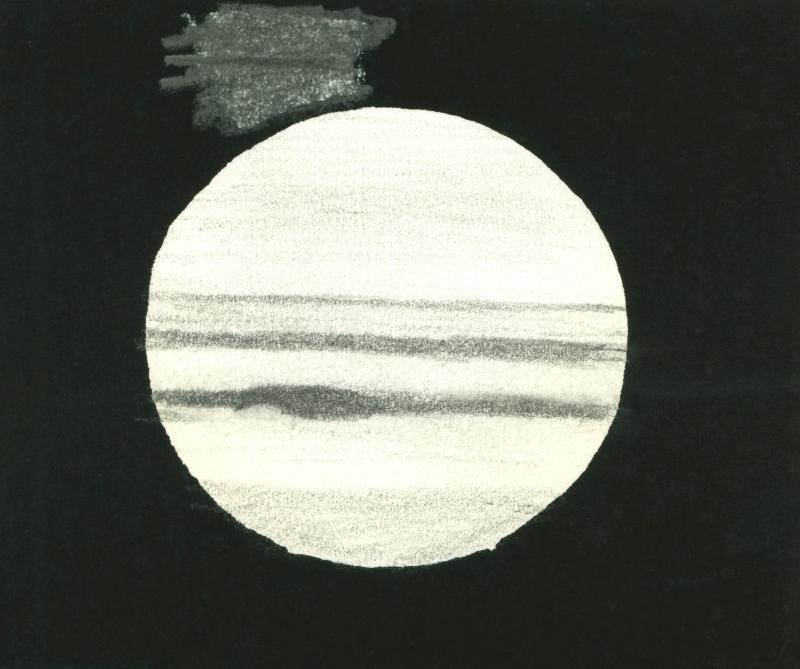 Jupiter on 1959 July 29/30 at 22:25 EDT (02:25 UT) as sketched by G. Wedge. C.M.(1) 323º, C.M.(2) 279º. 4" Townsend refractor at 180x. Seeing fair. Transparency poor.