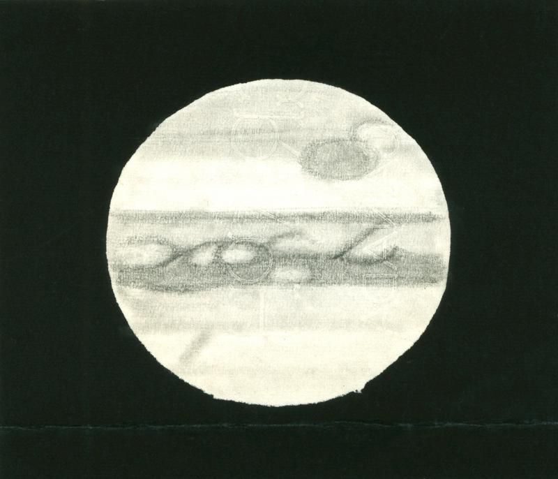 Jupiter on 1960 August 6/7 at 23:30-23:45 EDT (03:30-03:45 UT) as sketched by K.R. Brasch. C.M.(1) 348º, C.M.(2) 330.4º. 8" reflector at 165x. Seeing 3-5. Transparency 2-3. Enormous detail visible under good conditions, R.S. appeared pink followed by an oval gap in NNTeZ newly observed cloud object (streak) in NEB clearly visible at approximately 319.6º, having moved considerably to left.