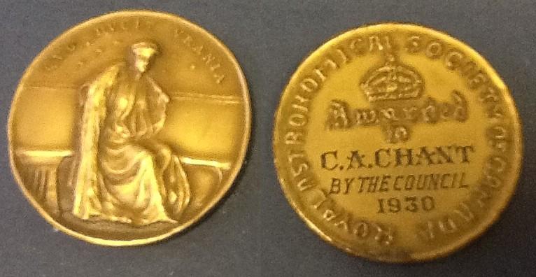 This is the medal (right) awarded to C.A. Chant in 1930. It is on display at the society's national office.