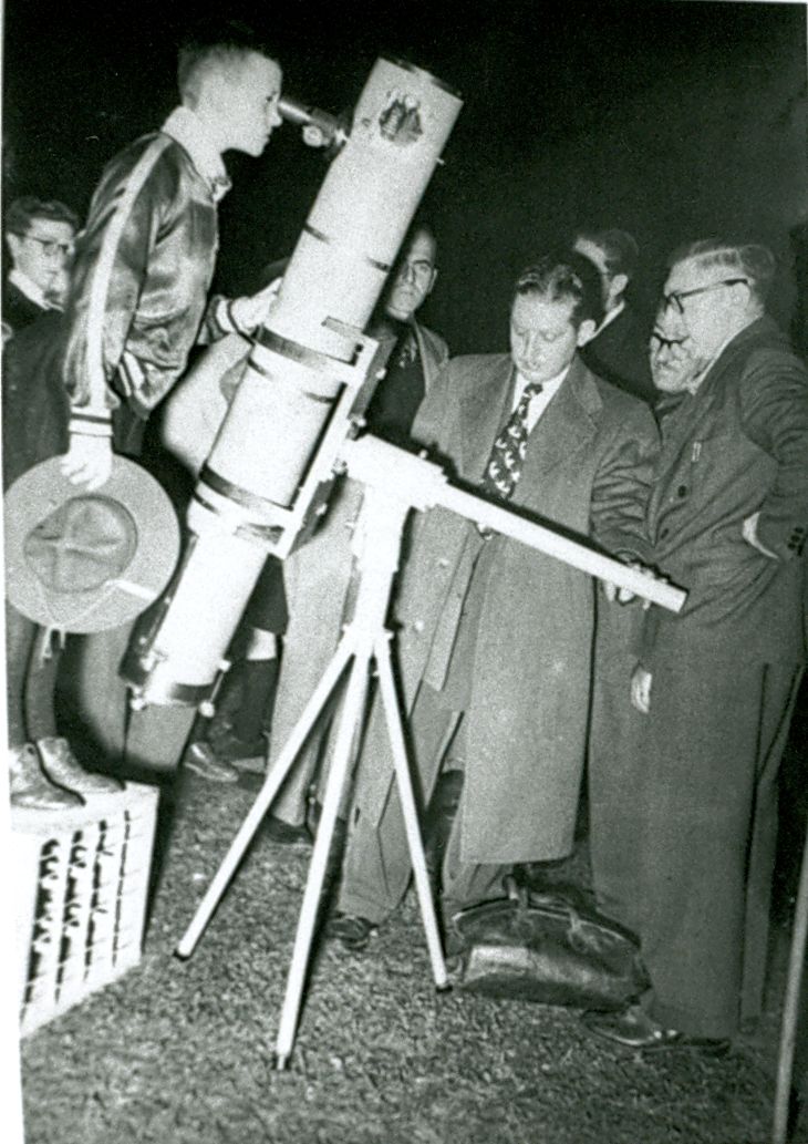Star Night at Westmount Park in Montreal on 1952 September 25 with a 6-inch reflector. R. Venn, R. Venor (with tie), M. Rosenthal, C. Fox, Dr. Charles Fox (right). Photo by H. Falconar & D. Murray; sent by Louie Bernstein of RASC Montréal Centre.