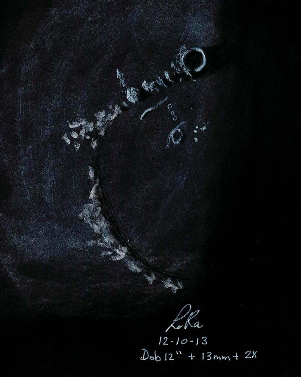 Louise Racine © 2012 October 13. 12-inch Dob, 13mm ocular, 2x barlow. White chalk on black paperboard.