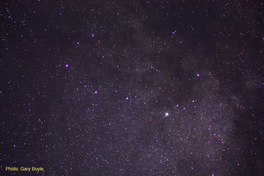 Further down the wing of the eagle is a fantastic open star cluster – M11. Commonly referred to as the “Wild Duck”, it is located 6,197 light-years away and is actually in the constellation of Scutum. Words cannot describe looking through a wide-angle eyepiece of a telescope to see the bright stars of the cluster against the backdrop of the Scutum Star Cloud. This star cloud is a view of the innermost galactic arm of the Milky Way called the Scutum-Centaurus Arm.
