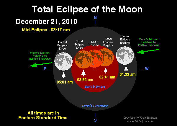 But now, thirty-four months later the drought is finally over. Our natural satellite will again hide in the icy shadows of mother Earth for a three and a half-hour show on December 21 – the same date as winter solstice which occurs at 6:38 p.m. Eastern Standard Time. On the east coast of North America, the Moon will make first contact with Earth’s shadow at 1:32 a.m., mid-eclipse will occur at 3:17 a.m. with the show ending at 5:01 a.m. At fourth contact, the Moon completely leaves our shadow.