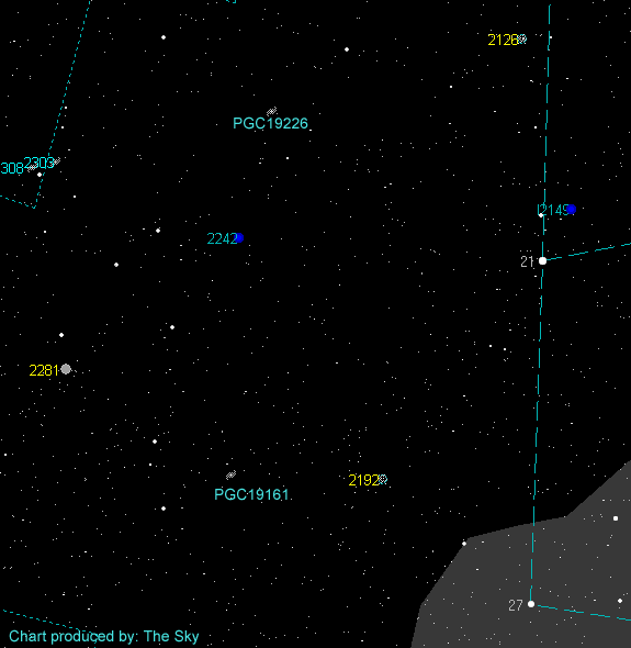 Located towards the top portion of Auriga lie two planetary nebulas. First on the menu is NGC 2242. Located a little more than six degrees from magnitude 2.1 Beta Auriga, this planetary does not possess the twisty spiral shape seen in but a nice round envelope of gas and dust expelled from the dead star. This 14th magnitude object is a definite challenge as one would need at minimum a 10-inch scope. The central star at measured to be magnitude 17.6. Our second stellar corpse is IC 2149. At low power, it looks like a typical 11th magnitude sun but the nebulosity reveals itself in higher magnifications. IC 2149 is an estimated 5,200 light-years away.