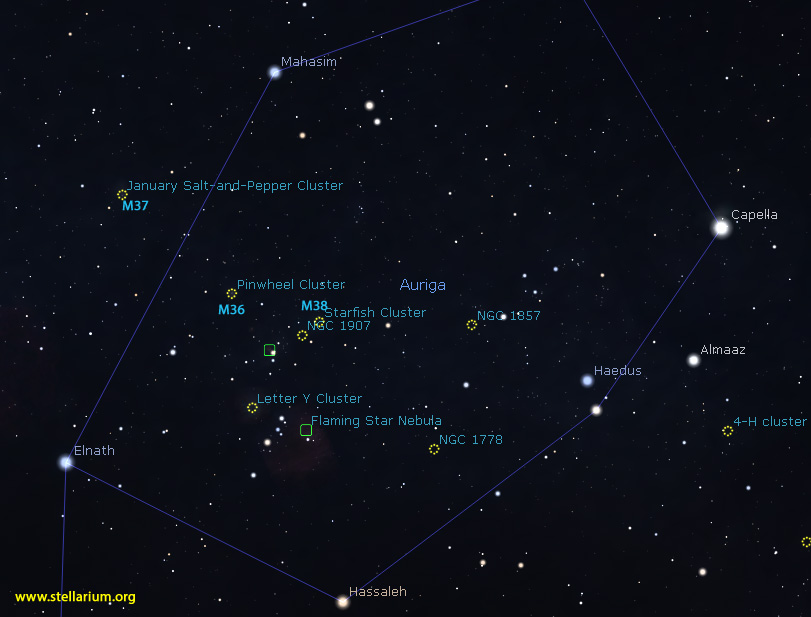 Embedded are three nice open star clusters located in the lower half of the asterism. From left to right, they are M37 also referred to as the Auriga Salt and Pepper Cluster, M36 – the Pinwheel Cluster, and M38 – the Starfish Cluster. Binoculars are only needed to locate these great groupings of distant suns. They reside 4,511, 4,340, and 3,480 light-years respectively from us. From country skies, Auriga and its clusters lie on the fainter winter Milky Way. With a dusting of fainter stars, this is a great wide-angle target to image from dark skies.