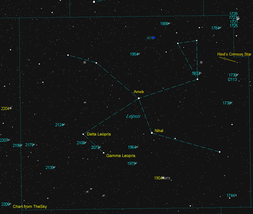 Lepus is one of the original 48 constellations catalogued by Ptolemy in the 2nd century and is home to the famous variable star named R Leporis, commonly referred to as Hind’s Crimson Star. The star’s deep red colour is only seen around its minimum. Its overall range from magnitude 5.5 to 11.7 is completed in 418 to 441 days. However, there may be a secondary period of 40 years also to contend with. Hind’s Crimson Star is located very close to the border with the constellation Eridanus. It is hard to read about a constellation that is not home to at least one star with an exoplanet. Lepus does own one such star. Gliese 229 is an M1 star residing only 18.77 light-years away and has an orbiting planet with a mass 20 to 50 times that of the planet Jupiter.