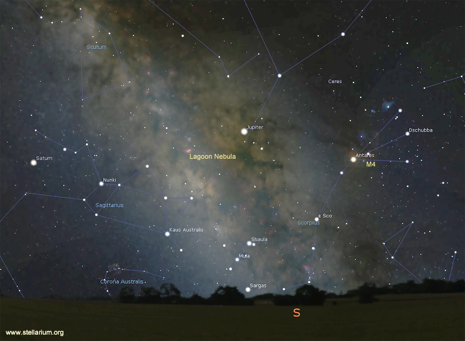 A great project for astrophotographers is the Rho Ophiuchi cloud complex which includes Antares. With simple binoculars, look for the globular cluster M4 located 1.3 degrees west of Antares. M4 is an estimated 7,200 ly away, about 75 ly in width and glows at magnitude 5.6.