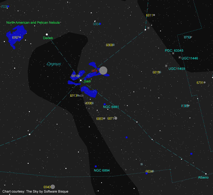 Directly south of Cygnus is Vulpecula the Fox. It is a moderate size constellation with 268 square degrees of sky making it 55th in overall size. There are a few interesting objects such as the combination of NGC 6820 and NGC 6823, also known as Sharpless Sh 2-86. At a distance of 6,000 light-years, NGC 6823 is a magnitude 7.1 open cluster surrounded by the emission nebula The pair is found five and a half degrees east of Alberio.
