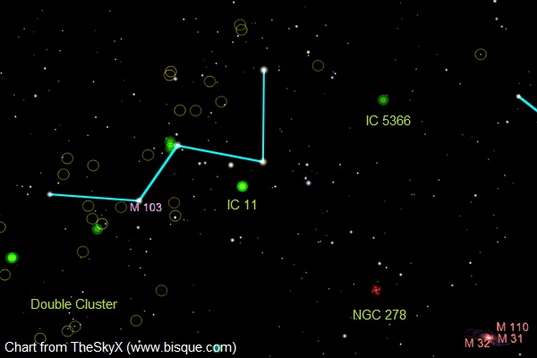 We now move east from Cepheus to the famous W outlining the queen. A fantastic open cluster just across the border from Cepheus is M52. Coined the salt and pepper cluster, M52 is a splash of about 200 stars. Once you have enjoyed its view, be sure to slide your scope 35 arc minutes southwest of the cluster to see the magnificent Bubble Nebula. The formation of NGC 7635 is the result of very fast stellar winds blowing off the Wolf-Rayet star seen within and causing the surrounding gas to balloon out – hence the bubble. This star could be going through its final stages of life till it erupts in a supernova explosion.