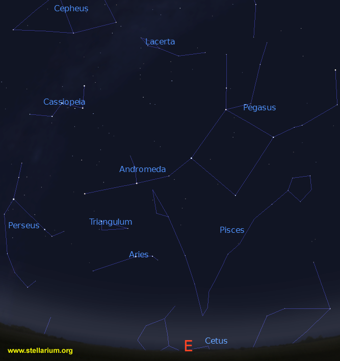 The galaxy is also home to numerous globular clusters to which a few are observed visually with photography needed to locate the fainter ones. With a telescope and a wide-angle eyepiece, one or two dust lanes are quite evident along with NGC 206 – a bright “star cloud” located at the galaxy’s edge near M32. From M31 move down the chain of three stars to the bright star Mirach. Here is a magnitude 2.07 spectral class M0 star residing 200 light-years from Earth. From here, try to put the star just outside the field of view to spot NGC 404 also called Leo 1. In fact, this isolated dwarf lenticular galaxy is found only seven arc minutes from Mirach. The galaxy itself is some ten million ly away and glows at magnitude 11.2.