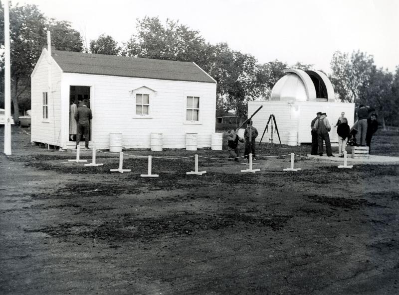 A general view of the Regina Astronomical Society's operations centre in 1955. The clubroom on the left is fully equipped for meetings during winter or summer. The barrels stock coal and wood as well as water and garbage disposal.
