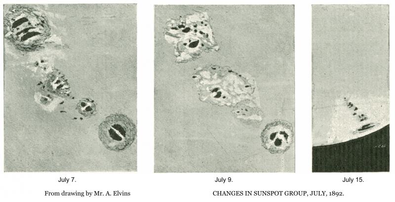 CHANGES IN SUN SPOT GROUP, JULY, 1892. From drawing by MR. A. ELVINS. Published in TAPST 1892.