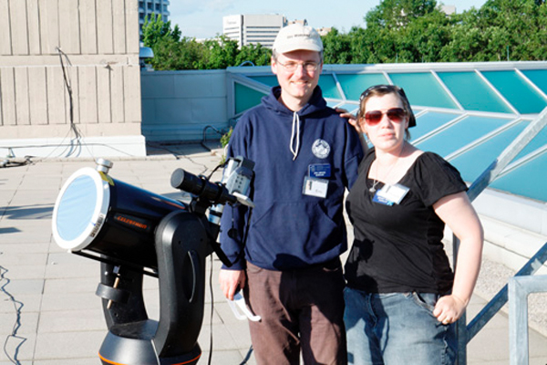 Dr. John Moores, who was preparing to do a lecture downstairs at the conclusion of the evening, joined us just before the clouds moved in. After all the equipment was carried downstairs and packed away, we visited the main RASC observing sites in the Teluscape forecourt and the north parking lot of the Science Centre. These sites are often used for RASC star parties, going back more than two decades to the planetary conjunction of June 14, 1991 when I recall more than a thousand people showed up. Brenda bumped into Prof. Caldwell, one of her instructors from her time at York University's astrophysics department. Paul Delaney at York University had set up another Transit station at the Keele Campus with webcasting through their 'yorkobservatory.com' portal.