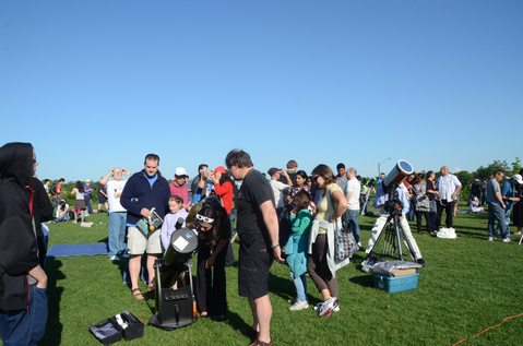 The weather was iffy until late in the day, but the clouds cleared and we were blessed with sunny skies until well into sunset. Over 1000 people came out to look at the event through about 15 scopes that the Centre had set up on the campus of the University of Toronto @ Mississauga. It was a real picnic atmosphere with blankets on the grass and people chatting while lining up to see the transit through the different scopes. We had a good number of families with young kids there, as well as many teenagers and young adults. For many, it was their first look through a telescope, and we heard lots of "wow"s.