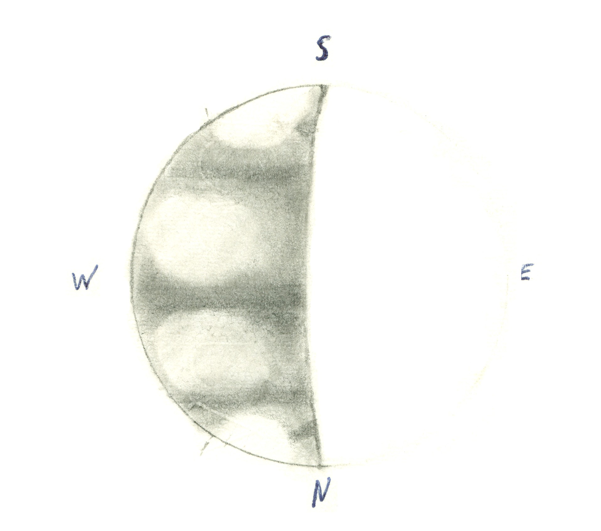 Venus on 1961 January 31 at 15:50 EST (20:50 UT) as sketched by Constantine Papacosmos. 6" refractor at 220x. Seeing 4-5/10. Transparency 3/5. The three parallel belts were seen  momentarily, as unbroken, sharply defined, grayish bands, and were the most conspicuous details at that moment.